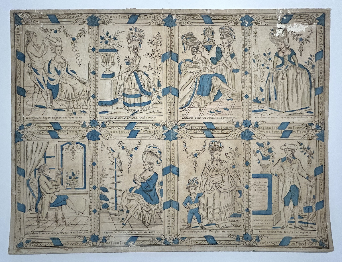 Bois gravé sur quatre feuilles raboutées, anciennement colorié au pochoir en bleu.